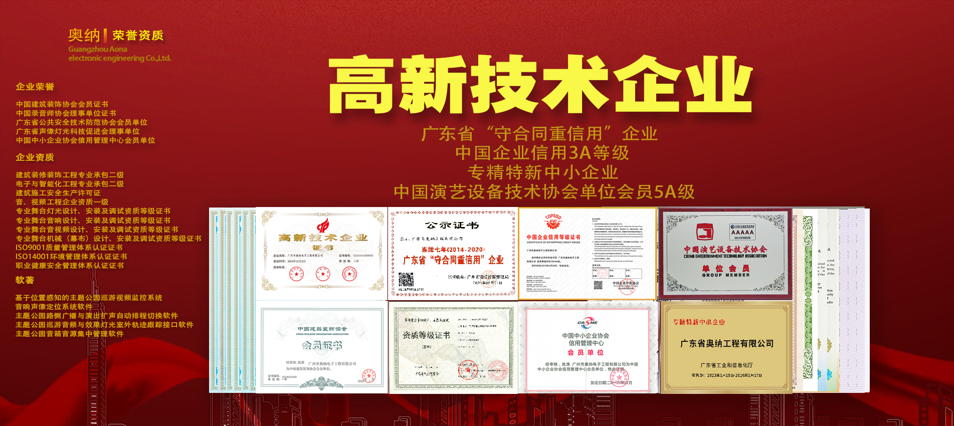 公司現擁有多項資質證書,獲得專利和軟著近百項,并先后榮獲百強工程商、優秀文旅演藝獎等獎項,在科學化、標準化、規范化方面深得客戶信賴。公司參與建設的“華南理工大學國際校區圖書館”榮獲2022-2023年度中國建設工程魯班獎。